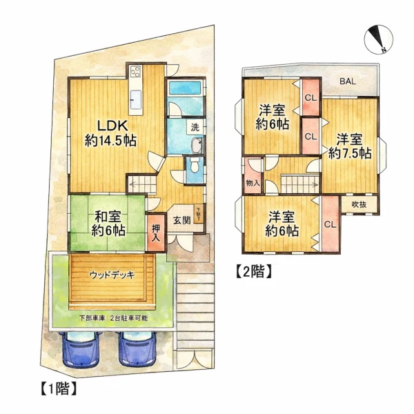 | 設備 | 上水道、都市ガス、電気、室内洗濯機置場、ガスコンロ、南面バルコニー、ウッドデッキ、ワイドバルコニー、駐輪場、駐車2台可、モニタ付インターホン、ビルトインガレージ、システムキッチン、庭、カウンターキッチン、ガスキッチン、3口以上コンロ、バス、シャワー、バス・トイレ別、浴室1坪以上、浴室に窓、洗面所、洗面台、シャンプードレッサー、温水洗浄便座、収納スペース、床下収納、ハイルーフ駐車場 | ||