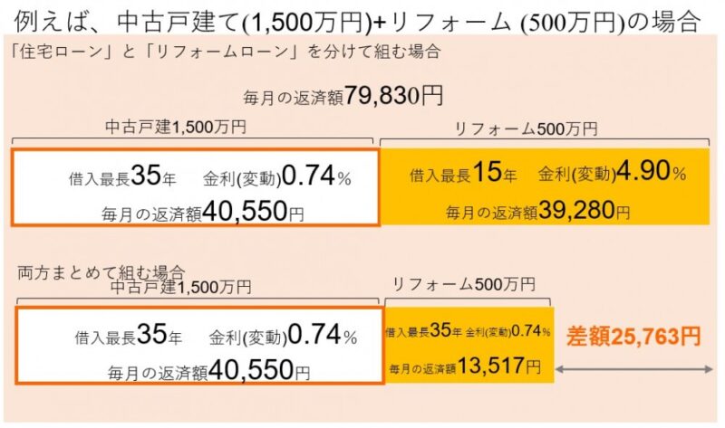 「物件購入」と「リフォーム」を同時に行い、両方をまとめて「住宅ローン」で組んだ方が金利が安く、