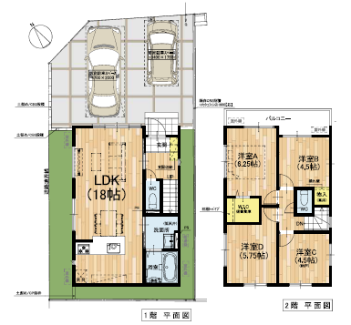 | 間取り | 3SLDK | 間取り内訳 | 1FLDK18畳×1室 2F洋6.2畳×1室 2F洋4.5畳×1室 2FS4.5畳×1室 2F洋5.7畳×1室 |