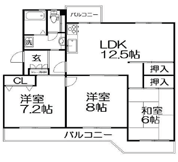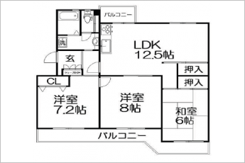 | 間取り | 3LDK | 間取り内訳 | LDK12.5畳×1室 和6畳×1室 洋8畳×1室 洋7.2畳×1室 |