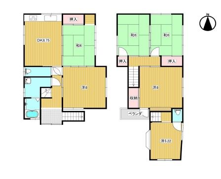 | 間取り | 6DK | 間取り内訳 | 1FDK8.7畳×1室 1F和6畳×1室 1F洋8畳×1室 2F和6畳×2室 2F洋8畳×1室 |
